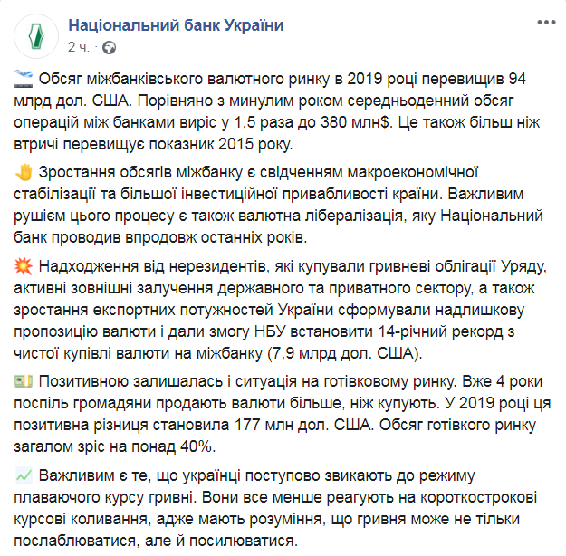 "Положительной оставалась и ситуация на наличном рынке. Уже 4 года подряд граждане продают валюты больше, чем покупают. В 2019 году эта положительная разница составляла 177 млн ​​долл. США. Объем наличного рынка в целом вырос более чем на 40%", - привели статистику в НБУ.