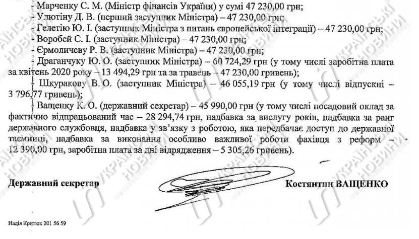 Зарплата первого заместителя Дениса Улютина составила 47 230 гривен, заместителей Юрия Гелетия - 47 230 гривен, Светланы Воробей - 47 230 гривен, Романа Ермоличева - 47 230 гривен, Юрия Драганчука - 60 724 гривны (в том числе зарплата за апрель - 13 494 гривны), Василия Шкуракова - 46 055 гривен, госсекретаря Константина Ващенко - 45 990 гривен.