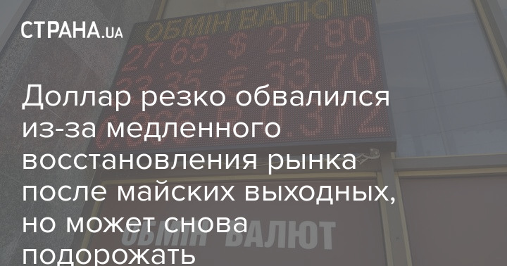 Доллар резко провалился после майских праздников: 11 мая его безналичный курс рухнул на 15 копеек, и остановился на 27,59-27,61 грн/$. Цены наличного рынка опустились не так сильно - на 5-10 копеек: