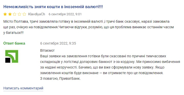 "Ваши заявки на заказ наличных были отменены из-за временных сложностей в логистике долларовых банкнот из-за границы. Мы извиняемся за причиненные неудобства", - пишут в банке в ответ на жалобы.