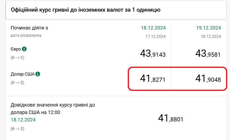 Цена доллара в Украине штурмует новые высоты. Сегодня, 18 декабря, Нацбанк поднял свой официальный курс в паре гривна/доллар с 41,8271 грн/$ до 41,9048 грн/$ (на 19 декабря). Это новый антирекорд девальвации гривны.