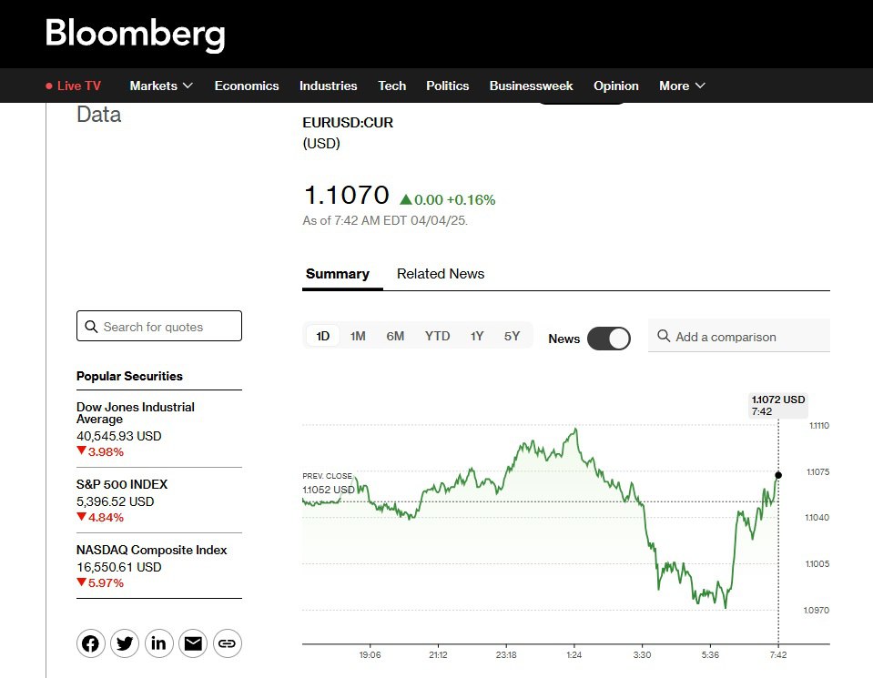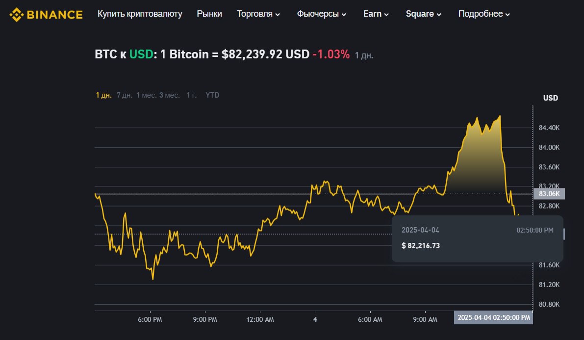 После вчерашнего ралли к 1,11 курс евро/доллар сегодня, 4 апреля, с утра просел до 1,0977, после чего скорректировался на 1,1072 (+0,16%). Биткоин, который в четверг проваливался до $81,8 тис. за одну монету в полдень пятницы подскочил на Binance к $84,62 тис., а после обеда отошел к $82,2 (-1,03%).