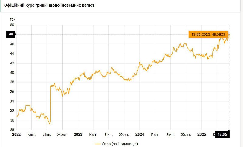 Сегодня в Украине резко подскочил курс гривны к евро. Национальны банк Украины зафиксировал на 13 июня свой официальный курс на уровне 48,08 грн/€ — это максимальное значение не только с начала большой войны, но и абсолютный максимум за всю историю, на 63 копейки больше значения предыдущего дня.