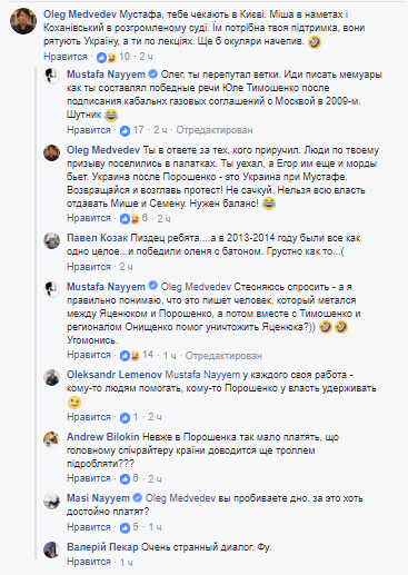 Под постом Найема о проблемах украинского бизнеса главный спичрайтер Порошенко забрасывает Мустафу стебными комментариями о том, что нардепу нужно "не лекции читать", а присутствовать на Майдане в Киеве.