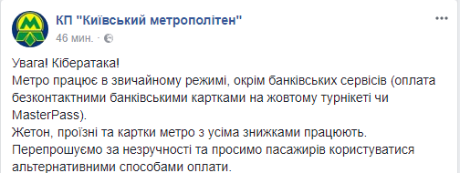 Как сообщает пресс-служба столичной подземки в Facebook, сейчас метро работает в обычном режиме, но недоступна оплата проезда банковскими сервисами: бесконтактными банковскими карточками на желтом турникете или MasterPass.
