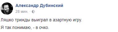 "Помню, Ляшко когда-то говорил, что имел игровую зависимость, и лишился. Но видно, что зависимость вернулась. Ведь чтобы трижды так выиграть, это сколько же надо было проиграть!", - написал в Facebook украинский журналист Игорь Ляшенко.