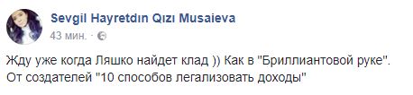 "Жду уже когда Ляшко найдет клад. Как в "Бриллиантовой руке". От создателей "10 способов легализовать доходы"", - пишет главный редактор "Украинской правды" Сегвиль Мусаева.