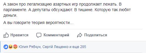 И добавляет, что уже трое депутатов из этой группы из шести человек выиграли в лотерею. "В Национальную лотерею выиграли. Которой хорошо сейчас. И которая принадлежит совсем не государству. И которой не нужна конкуренция. Последний выигравший Олег Ляшко, так вообще три раза подряд выиграл. А до этого депутат Кишкарь выигрывал. Он даже говорил, что придумал математическое решение для победы в лотерее. Именно математическое. Не коррупционное. Пока никому не показывал, но говорит, что работает. Всем любопытно. Это ведь прорыв в математике. Выиграл ведь. Не поспоришь. Может он только Ляшку рассказал... А закон про легализацию азартных игр продолжает лежать. В парламенте. А депутаты обсуждают. В тишине. Которую так любят деньги. А вы говорите теория вероятности…", - резюмировал инвестиционный банкир.