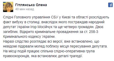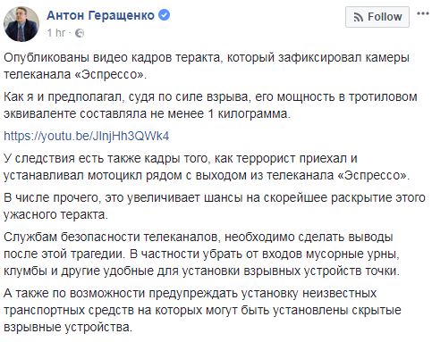 16:07  Следствие располагает кадрами, как террорист устанавливал мотоцикл рядом с выходом из телеканала "Эспрессо". Об этом на своей странице в Facebook сообщил внештатный советник министра внутренних дел Антон Геращенко.