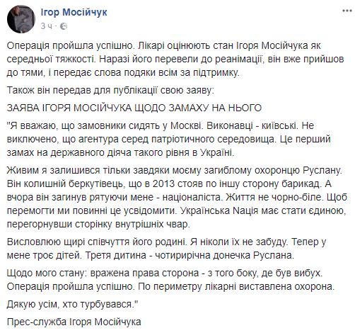 11:50  Группу прокуратуры по расследованию возглавил Павел Кононенко. По его словам, основных версий три - покушения на Мосийчука по линии российских спецслужб, политических оппонентов и по личным мотивам. Добавочных версий две - покушение на политолога Балу и какого-либо другого политика (на телеканал Эспрессо они приходят часто).