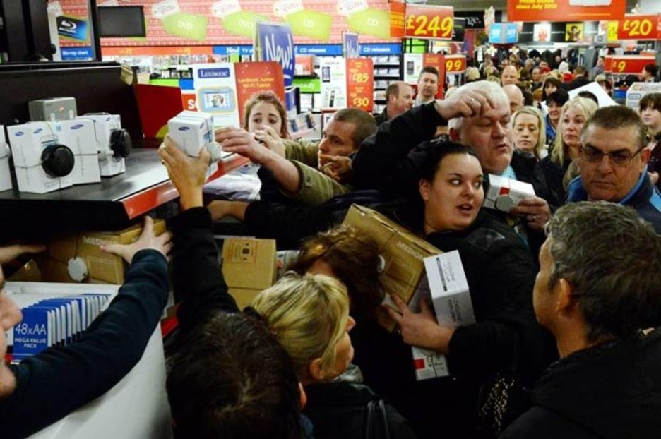 В западных странах стало традицией занимать очередь под магазинами с ночи, а то и с вечера, а попав в торговый зал, сгребать все, что попадется под руку, чтобы не упустить выгодную покупку. Часто люди травмируются в давке, нередки и потасовки из-за приглянувшегося разным людям товара.