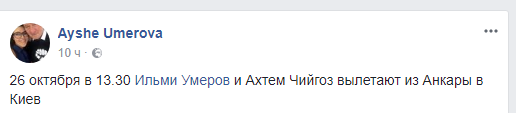 "26 октября в 13:30 Ильми Умеров и Ахтем Чийгоз вылетают из Анкары в Киев", - написала она.