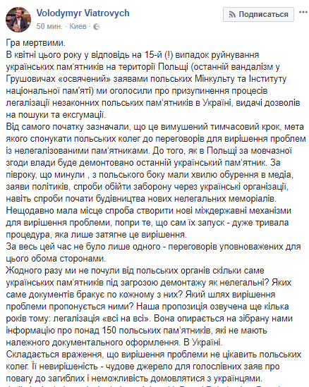 "Изначально отмечали, что это вынужденный временный шаг, цель которого побудить польских коллег к переговорам для решения проблем с памятниками до того, как в Польше при молчаливом согласии властей демонтируют последний украинский памятник", - написал Вятрович.