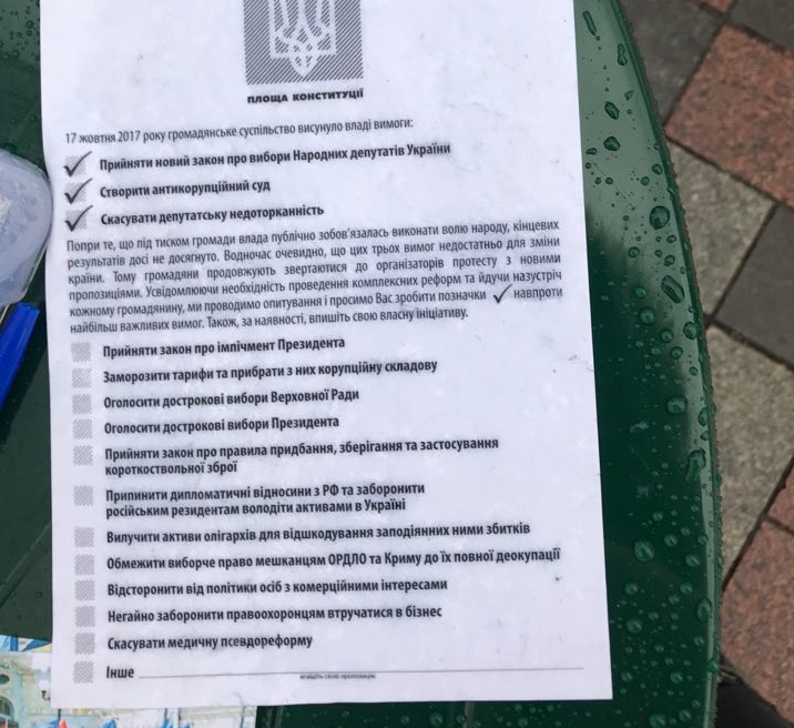 Во время вече с Михаилом Саакашвили, которое прошло перед Верховной Радой 29 октября, его участникам предложили проголосовать за новые требования к власти. Для этого собравшимся раздали анкеты с перечнем расширенных требований, чтобы они смогли отметить наиболее важные для них пункты. Об этом сообщает корреспондент "Страны".