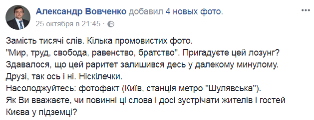 На станции метро "Шулявская" в Киеве до сих пор сохранились коммунистические лозунги. Об этом сообщил президент Института реформ и развития Киева Александр Вовченко.