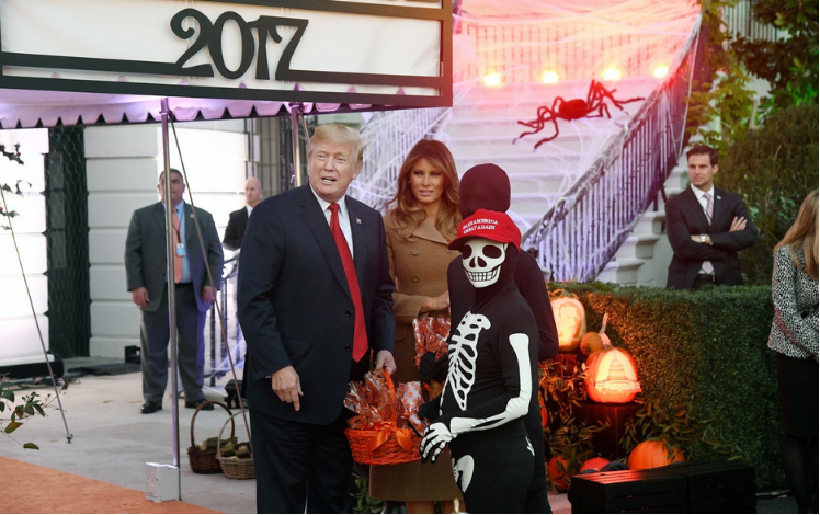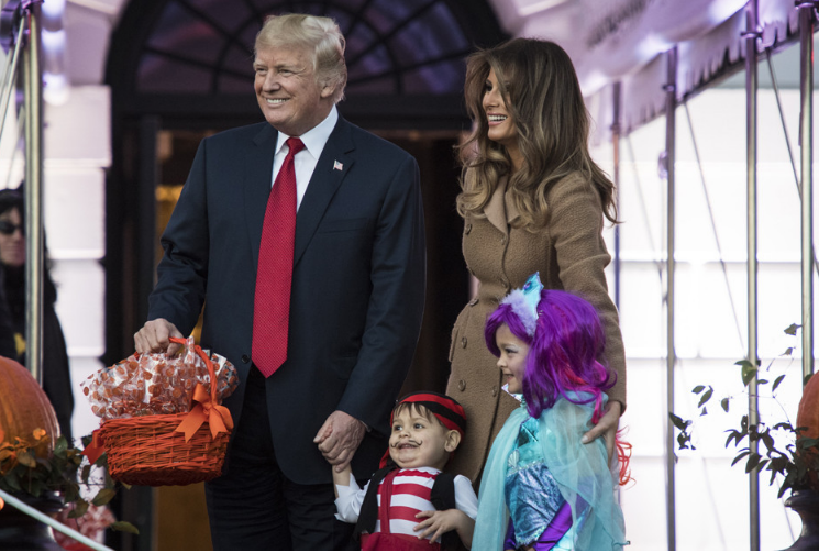 Дональд Трамп с супругой Меланией продолжили многолетнюю традицию празднования Хэллоуина в Белом доме. На лужайке у резиденции в Вашингтоне они раздали подарки детям, которые пришли в костюмах скелетов, полицейских, персонажей "Звездных войн" и динозавров.