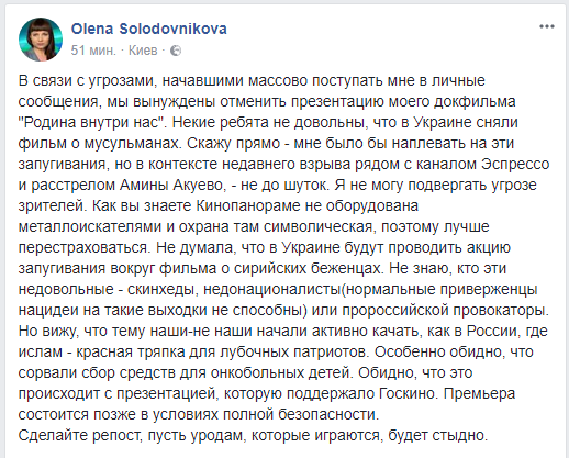 "В связи с угрозами, начавшими массово поступать мне в личные сообщения, мы вынуждены отменить презентацию моего докфильма "Родина внутри нас". Некие ребята не довольны, что в Украине сняли фильм о мусульманах", - сообщила Солодовникова.