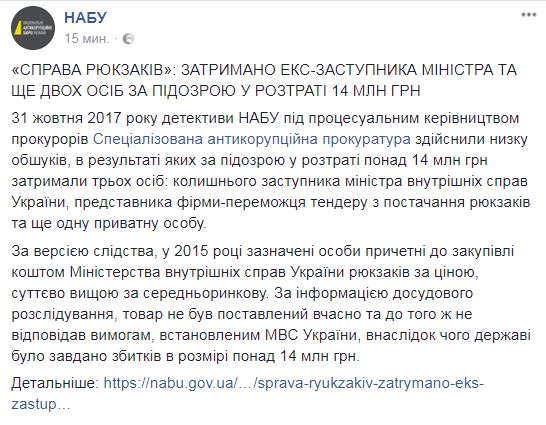После обысков по "делу о рюкзаках", в котором замешан сын главы МВД, детективами Национального антикоррупционного бюро по подозрению в растрате более 14 млн грн задержали трех человек: бывшего заместителя министра внутренних дел Украины, представителя фирмы-победителя тендера по поставке рюкзаков и еще одно частное лицо.