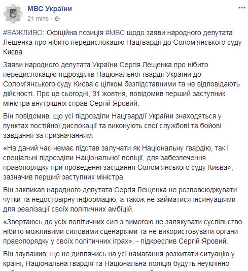 "Заявления народного депутата Украины Сергея Лещенко о якобы передислокации подразделений Национальной гвардии Украины в Соломенский суд Киева вполне безосновательными и не соответствуют действительности", - заявил он.