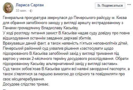 Пресс-секретарь генпрокурора Лариса Сарган сообщила, почему суд отпустил под залог экстрадированного из Панамы Владислава Каськива. Об этом она написала в Facebook.