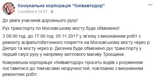 "С 09.00. до 17.00. 05.11.2017 в связи с выполнением работ по ремонту асфальтобетонного покрытия на Московском мосту через р. Днепр и моста через р. Десенка будет ограничено движение транспорта в первой полосе движения в направлении жилого массива Троещина", - говорится в сообщении компании.