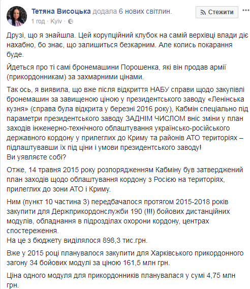 "Этот коррупционный клубок на самой верхушке власти действует нагло, потому что знает, что останется безнаказанным, - пишет Высоцкая. - Речь идет о тех же бронемашинах Порошенко, которые он продал армии (пограничникам) по заоблачным ценам.