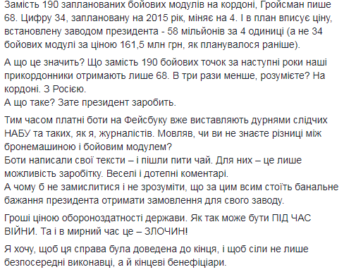 Вместо 190 запланированных боевых модулей на границе, Гройсман пишет 68. Цифру 34, запланированную на 2015 год, меняет на 4. И в план вписывает цену, установленную заводом президента - 58 000 000 за 4 единицы (а не 34 боевых модуля по цене 161,5 млн грн, как планировалось ранее).