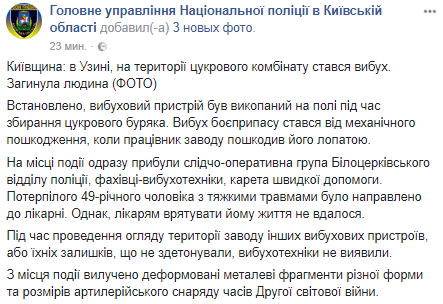 В Узине Киевской области на территории сахарного комбината произошел взрыв. Погиб человек. Об этом в Facebook сообщает полиция Киевской области.