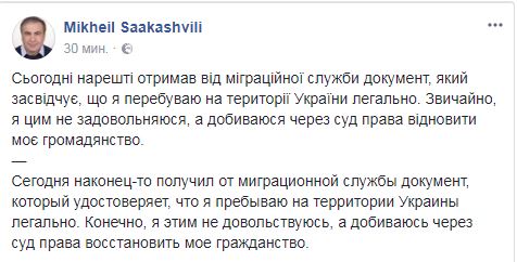 Лишенный украинского гражданства экс-глава Одесской обладминистрации и экс-президент Грузии Михаил Саакашвили заявляет, что получил от Государственной миграционной службы Украины документ, подтверждающий легальность его нахождения на территории Украины.