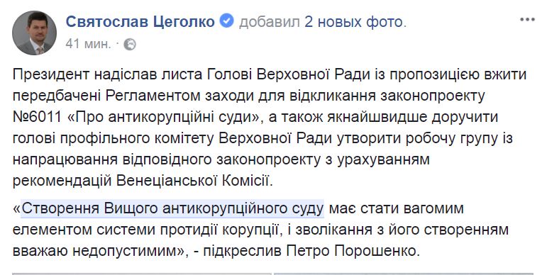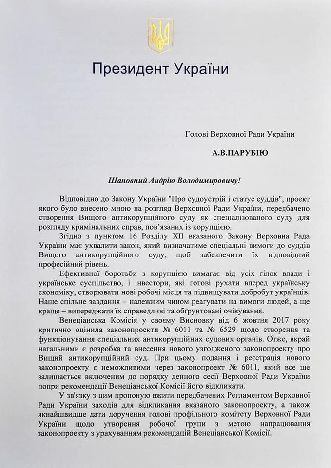"Венецианская комиссия в своем выводе от 6 октября 2017 года критически оценила законопроекты №6011 и №6529 о создании и функционировании специальных антикоррупционных судебных органов... При этом подача и регистрация нового законопроекта невозможна из-за законопроекта №6011, который все еще остается включенным в повестку дня сессии Верховной Рады Украины", - пишет президент.