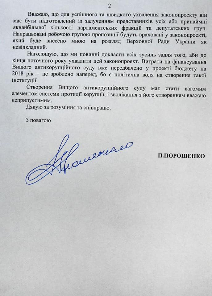 "Мы должны приложить все усилия, чтобы до конца текущего года принять этот законопроект. Расходы на финансирование Высшего антикоррупционного суда уже предусмотрены в проекте бюджета на 2018 год", - говорится в письме.