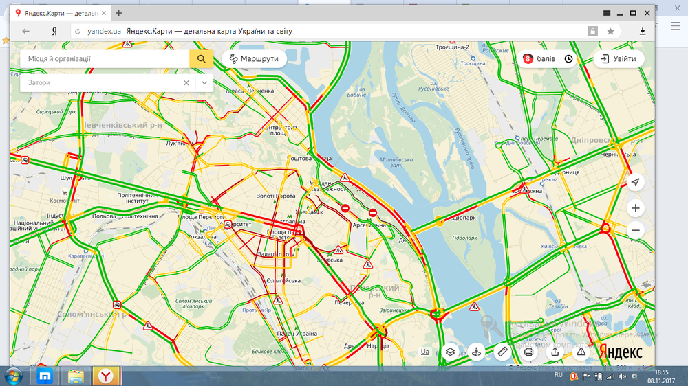 Вечером 8 ноября в Киеве наблюдаются пробки 8 баллов, согласно данным сервиса Яндекс пробки.