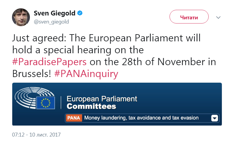 "Европейский парламент 28 ноября в Брюсселе проведет специальное слушание по Paradise Papers", - написал он.