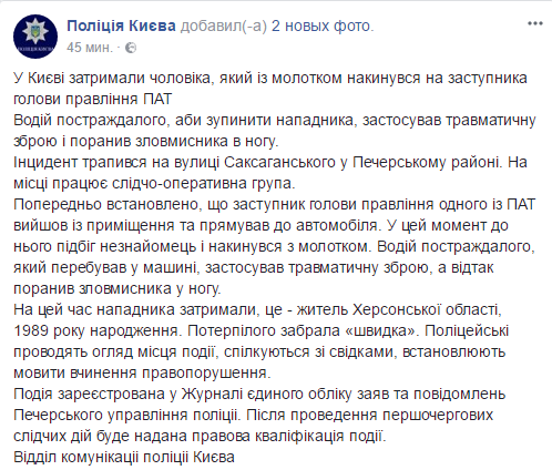 В Киеве в пятницу 10 ноября задержали мужчину, который с молотком набросился на заместителя председателя правления ОАО.