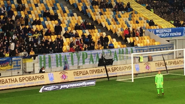 Во время товарищеской игры со сборной Словакии на трибунах заполненной Арены Львов появился баннер со словами "Нет натурализации".