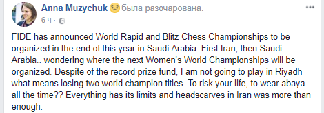 Украинская шахматистка Анна Музычук завила, что не будет участвовать в чемпионате мира по блицу и рапиду в Саудовской Аравии из-за строгого дресс-кода. Об этом она написала на своей странице в Facebook.