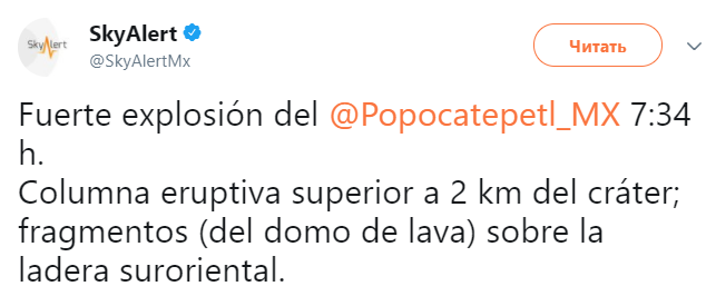 В Центральной Мексике просыпается вулкан Попокатепетль, который периодически извергал пепел с сентября. Об этом сообщает SkyAlert в Twitter.