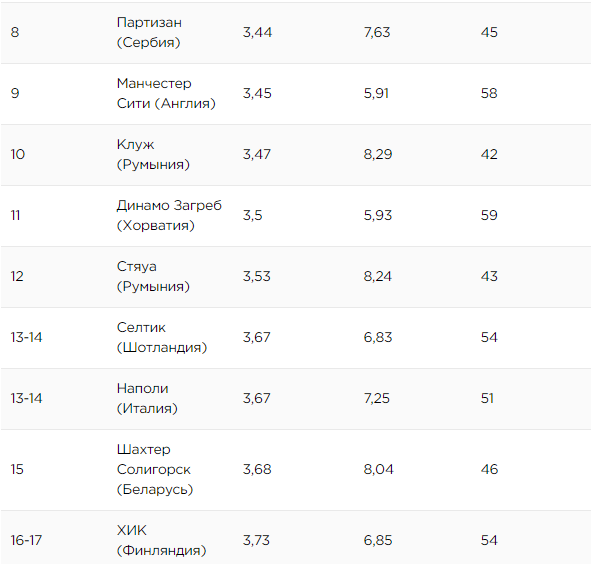 В этом рейтинге лидерами по странам следует считать Германию (Бавария и Боруссия Д заняли места в топ-10). Также двумя клубами представлены Словакия (Жилина и Тренчин), Греция (ПАОК и АЕК) и Испания (Барселона и Реал).