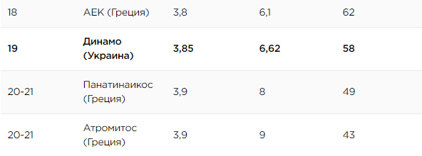 Наибольшее представительство в данном компоненте представлено греческими клубами - ПАОК, АЕК, Панатинаикос и Атромитос. Примечательно, что в рейтинге отсутствует действующий чемпион Греции Олимпиакос.