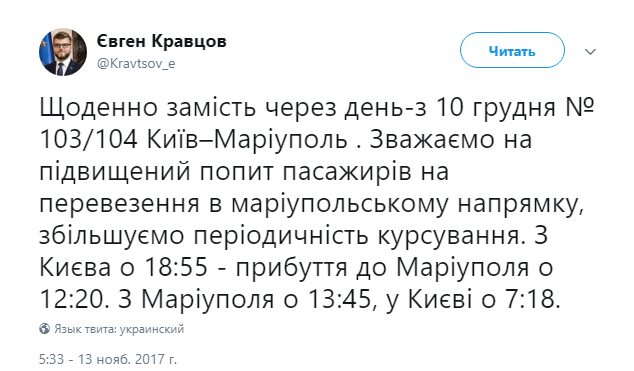 "Из Киева в 18:55, прибытие в Мариуполь в 12:20. Из Мариуполя в 13:45, в Киеве в 7:18", - сообщил Кравцов.