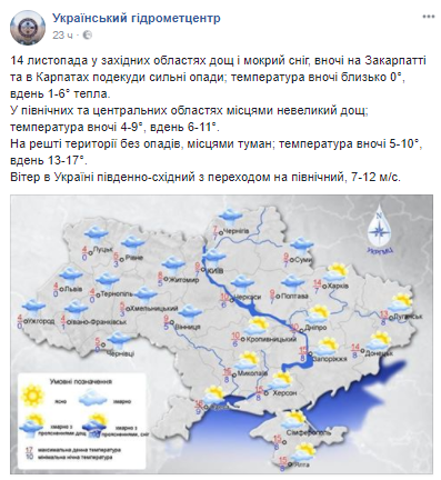 Погоду в Украине 14 ноября будет определять гребень антициклона и прохладный воздух, перемещающийся с Центральной Европы. В Западных областях ожидается мокрый снег и сильные осадки. Об этом сообщает пресс-служба Укргидрометцентра.