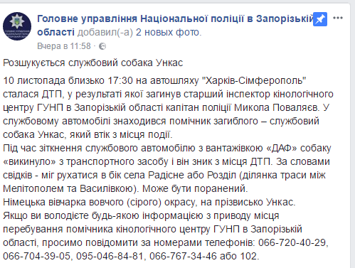 Напомним, Ункаса искали с 10 ноября, когда результате столкновения служебного автомобиля с грузовиком DAF скончался старший инспектор кинологического центра Главного управления Национальной полиции в Запорожской области капитан полиции Николай Поваляев.