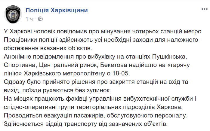 В Харькове в час пик неизвестный сообщил о заминировании сразу четырех станций метро: Пушкинской, Спортивной, Бекетова и Центрального рынка.