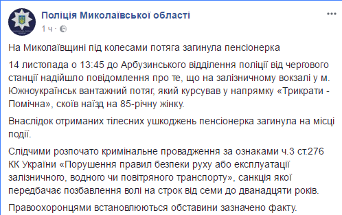 Отмечается, что 14 ноября на железнодорожном вокзале в Южноукраинске грузовой поезд, который следовал в направлении Трикраты-Помошная, сбил 85-летнюю женщину. В результате полученных повреждений пенсионерка погибла на месте.