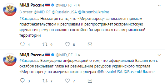 МИД России заявил, что сайт "Миротворец" базируется на американских серверах. Об этом сказала официальный представитель министерства Мария Захарова, заявление которой размещено в Twitter МИД.