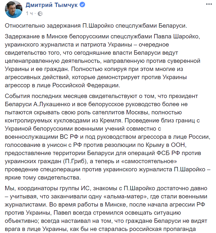 "Мы, координаторы группы ИС, знакомы с П.Шаройко достаточно давно – учитывая, что заканчивали одну "альма-матер", где стали военными журналистами", - написал Тымчук, имея в виду Львовское высшее военно-политическое училище.