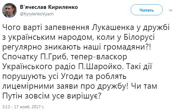 "Чего стоят заверения Лукашенко в дружбе с украинским народом, когда в Беларуси регулярно исчезают наши граждане?! Сначала Павел Гриб, теперь - собкор Украинского радио Павел Шаройко. Такие действия нарушают все соглашения и делают лицемерными заявления о дружбе! Там Путин совсем все решает?", - заявил Кириленко.