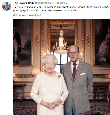 Фото монаршей пары обнародовано на странице Букингемского дворца в Twitter. Для снимка Елизавета II выбрала то же платье, в котором была на праздновании бриллиантовой свадьбы - 55 лет. Она дополнила его брошкой, подаренной мужем.