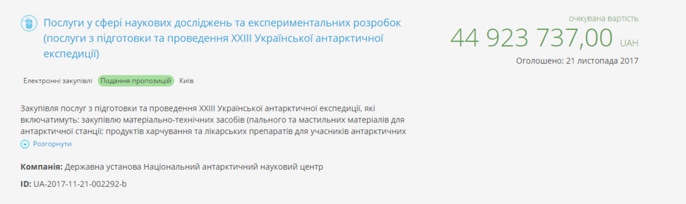 Государственное учреждение "Национальный антарктический научный центр" объявил тендер на услуги в сфере научных исследований и экспериментальных разработок (услуги по подготовке и проведению Украинской антарктической экспедиции) на общую сумму 44 923,7 тыс. гривен.