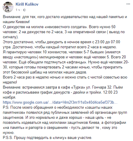 Также экс-нардеп Кирилл Куликов призвал неравнодушных киевлян организовать дежурство в парке Славы. "Всего нужно 50 человек: 2 на дежурстве по 2 часа, 3 на оперативной связи ( выезд по сигналу). Этого достаточно, чтобы дежурить в ночное время с 23:00 до 07:00 утра. Достаточно, чтобы каждый потратил всего 2 часа в неделю", - написал Куликов в Facebook.